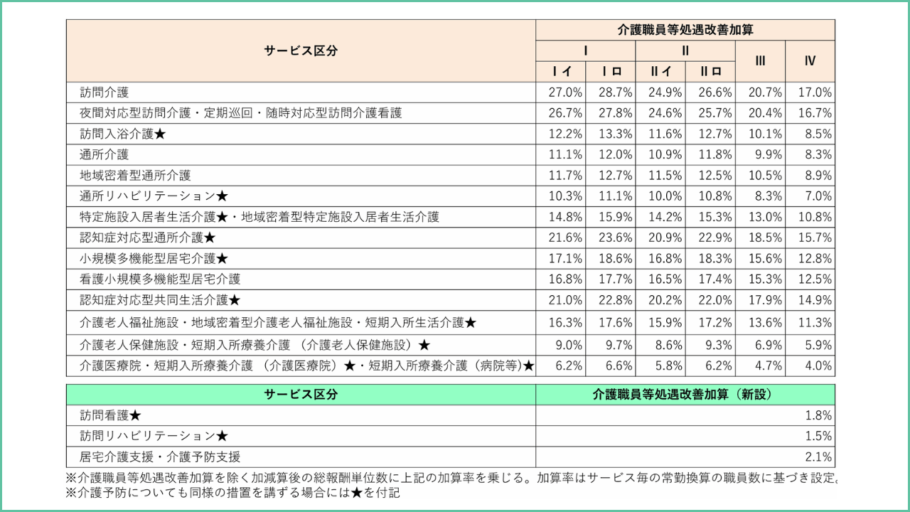 先のとおり、これまで処遇改善加算の対象外だったサービスに、新たに加算が設けられました。
