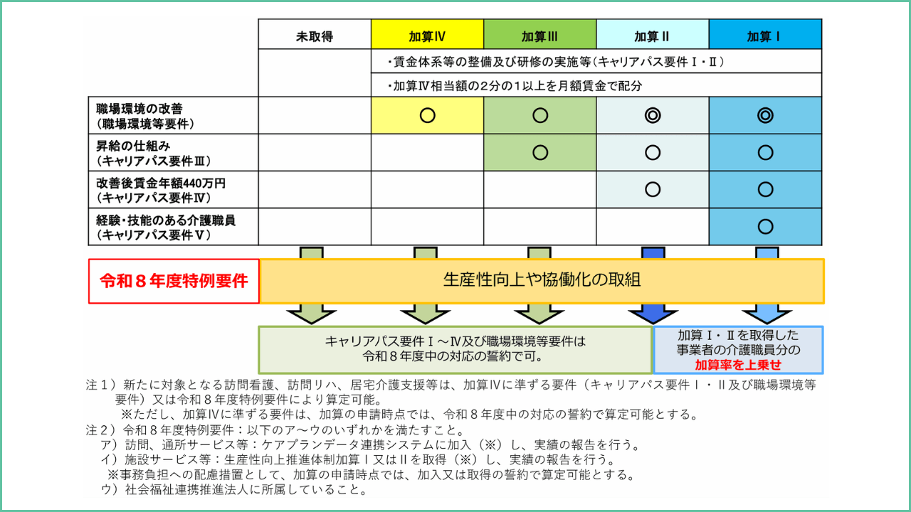 より高い加算率である「Ⅰロ」や「Ⅱロ」を取得するためには、生産性向上や協働化の取組として「令和8年度特例要件」を満たす必要があります 。