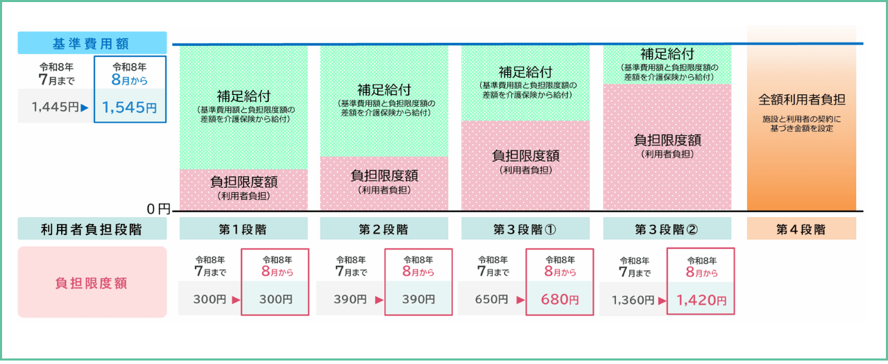 令和8年8月より、介護保険施設等における食費の基準費用額が1日あたり100円(1,445円から1,545円へ)引き上げられます。
