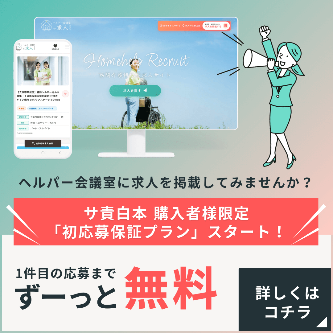 CHECK ヘルパー会議室からお知らせヘルパー会議室では、日々の業務に役立つ情報発信だけでなく、訪問介護・訪問系障害福祉サービスに特化した「厳選求人情報」も掲載しています。転職をお考えの際や、より良い環境をお探しの際は、ぜひ一度覗いてみてください!(求人を掲載したい事業者さんも募集中です!)