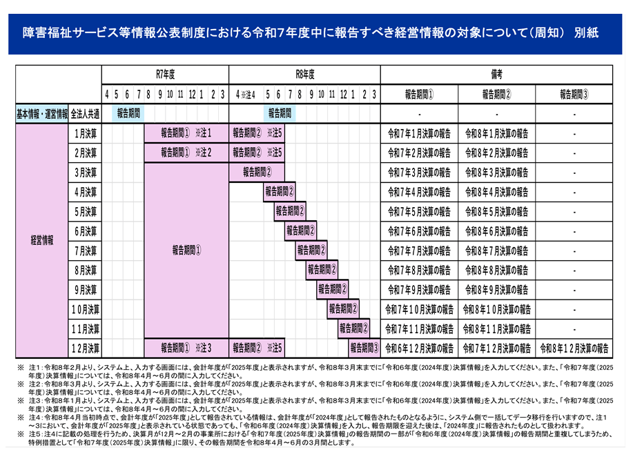• 特例スケジュール:上記に伴い、12月〜2月決算事業所の「令和7年度(2025年度)決算情報」の報告期間については、特例として【令和8年4月〜6月】の間に報告を行うこととされています 。