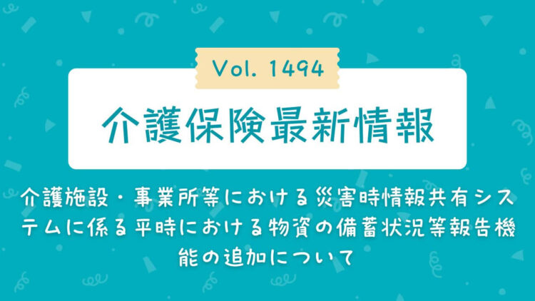 令和8年4月13日、厚生労働省は、介護保険最新情報vol.1494「介護施設・事業所等における災害時情報共有システムに係る平時における物資の備蓄状況等報告機能の追加について」を発出しました。
